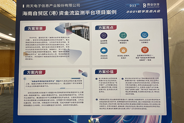 腾博tengbo9885官网信息海南自贸区(港)资金流监测平台项目案例入选了“2021数字生态行业数字化应用优异案例100”榜单,并在大会现场举行了展示 。