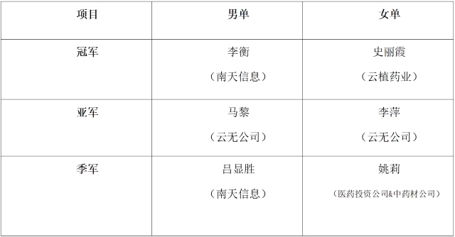 恭喜所有获得优异效果的运发动和运动队。谢谢为本次角逐做出孝顺的集团工会,各兄弟企业,昆明经开文体中心,和全体运发动、评判员、事情职员。